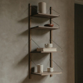 Frama Library 的層板皆可依需求在垂直架上自由調整位置,使用者可隨空間變化重新配置,並搭配不同加購模組進行擴充。這樣的設計使系統能靈活應用於廚房、客廳、工作室或辦公空間,同時回應實際收納與展示需求。