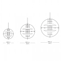 整體結構由透明壓克力外球體與五層懸掛於鋼鏈上的內部反射片組成。反射片以上色鋁質或玻璃材質製成,呈現多層次的光影與色彩變化,既具未來感又不失優雅。這種懸浮結構令光線在球體中自由流動,宛如漂浮的行星,散發柔和而戲劇性的光暈。