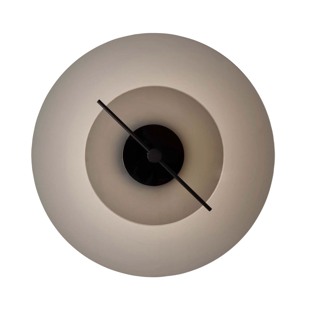 燈體由筒狀壁面支架、兩片不同尺寸的玻璃圓盤,以及一支金屬調節桿所構成。透過精巧的機械設計,外層玻璃可進行遮光處理,讓光線在透明與霧化之間流動變化,營造柔和而富層次的光感效果。