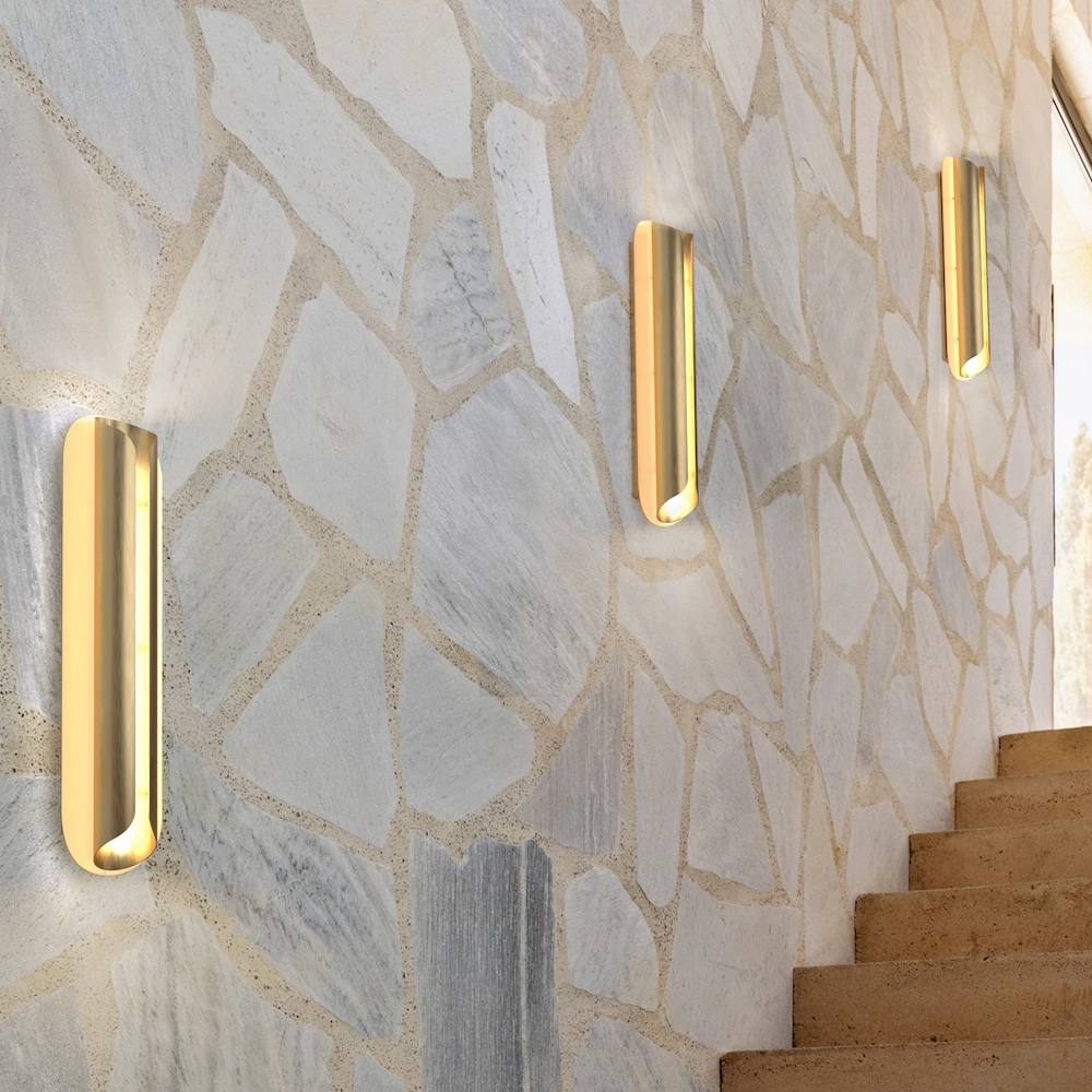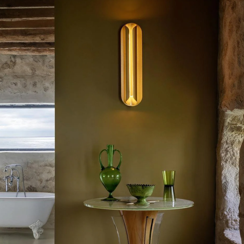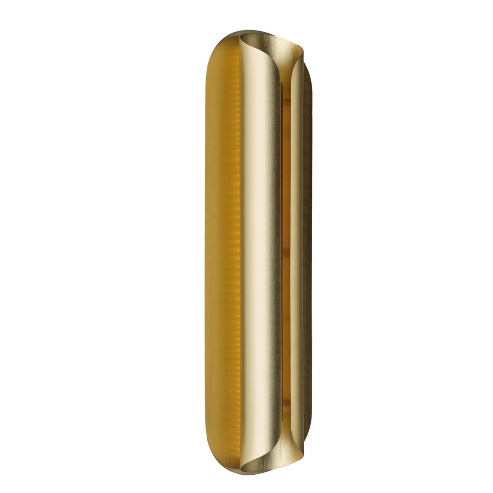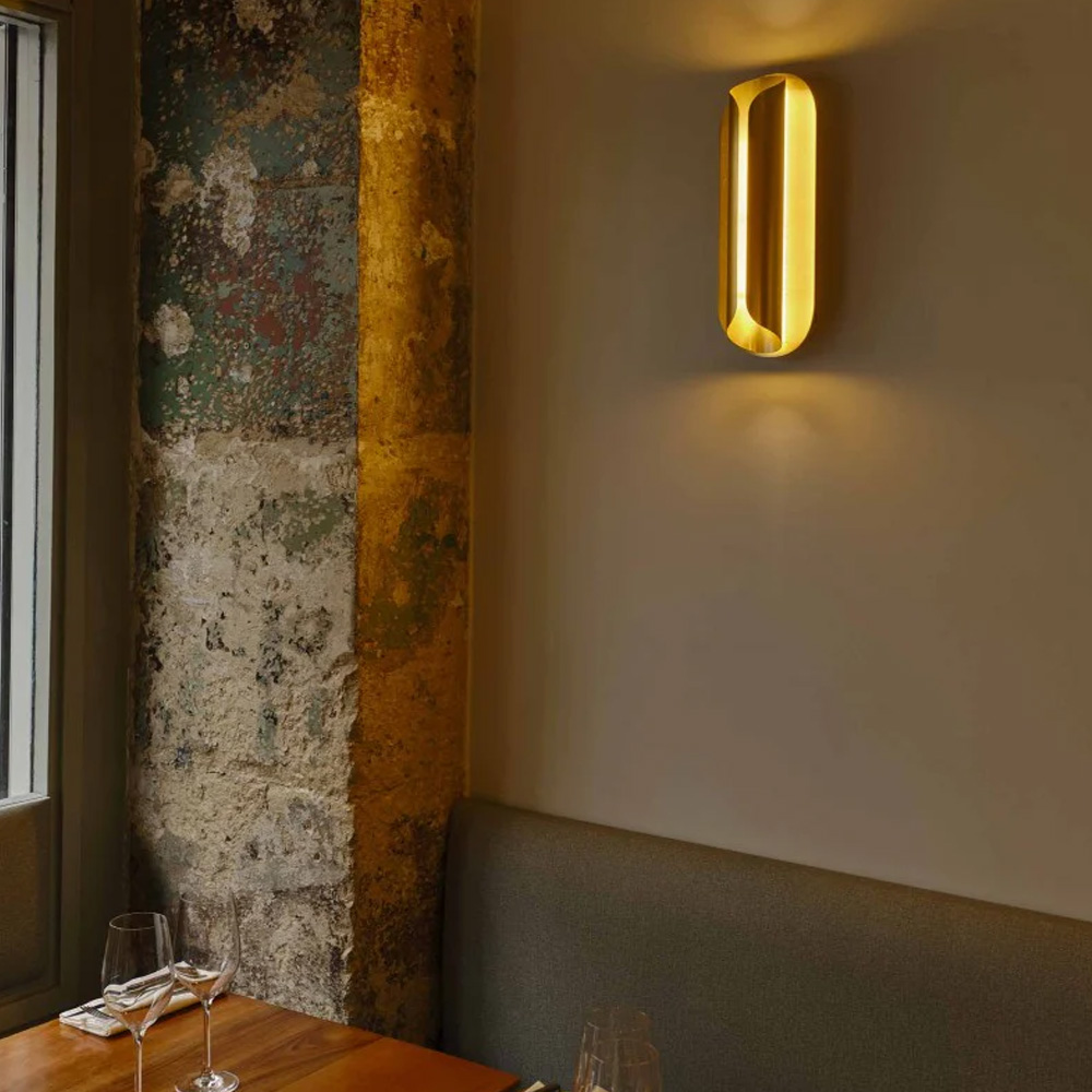 燈體由多片纖薄的陽極氧化鋁板構成,線條微微彎曲,包覆並保護光源,如同一只精緻的金屬外殼。常見的金色表面處理賦予燈具低調而洗鍊的質感,使其在牆面上呈現出優雅而現代的存在感。