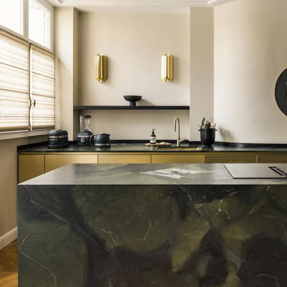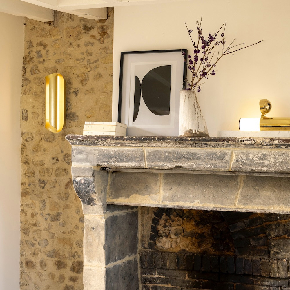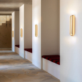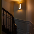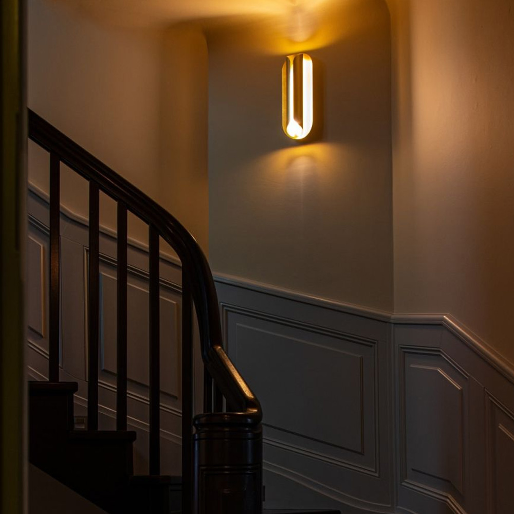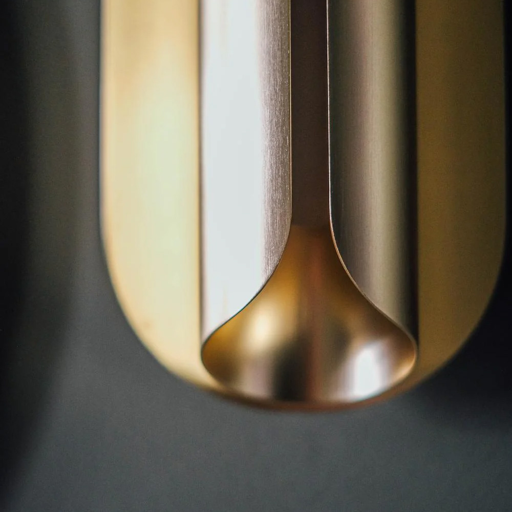 燈體由多片纖薄的陽極氧化鋁板構成,線條微微彎曲,包覆並保護光源,如同一只精緻的金屬外殼。常見的金色表面處理賦予燈具低調而洗鍊的質感,使其在牆面上呈現出優雅而現代的存在感。