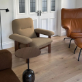 在材質運用上,柔軟布料與結構木件形成對比,使整體在視覺上既具重量感,卻不顯壓迫。Brasilia Lounge Chair 不追求輕盈或透明,而是透過低重心與寬闊比例,營造出一種安定、從容且高度人性化的空間存在,適合作為私人居所或公共場域中具象徵性的休憩座椅。