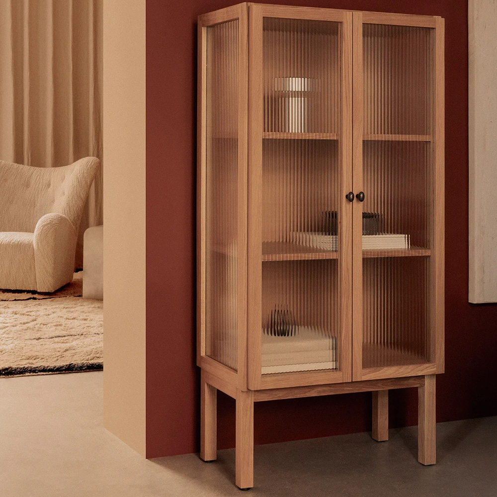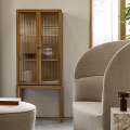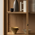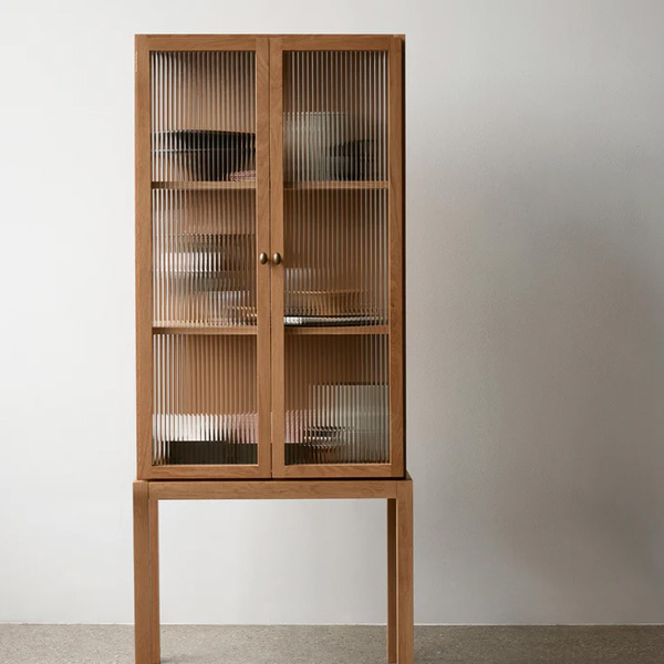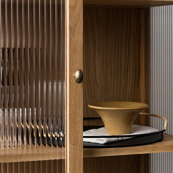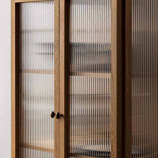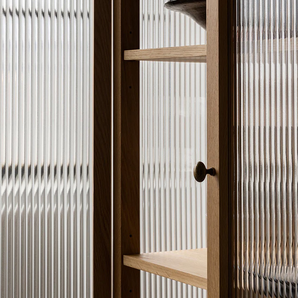 櫃門採用優雅的直紋壓紋玻璃(Reeded Glass),在保持光線通透的同時,柔和地模糊櫃內物件的輪廓,使收藏與收納之間取得恰到好處的平衡。若隱若現的視覺效果,為空間增添層次與靜謐的美感。