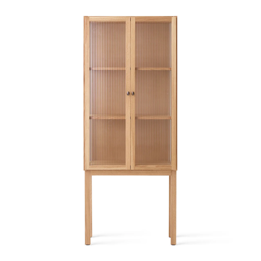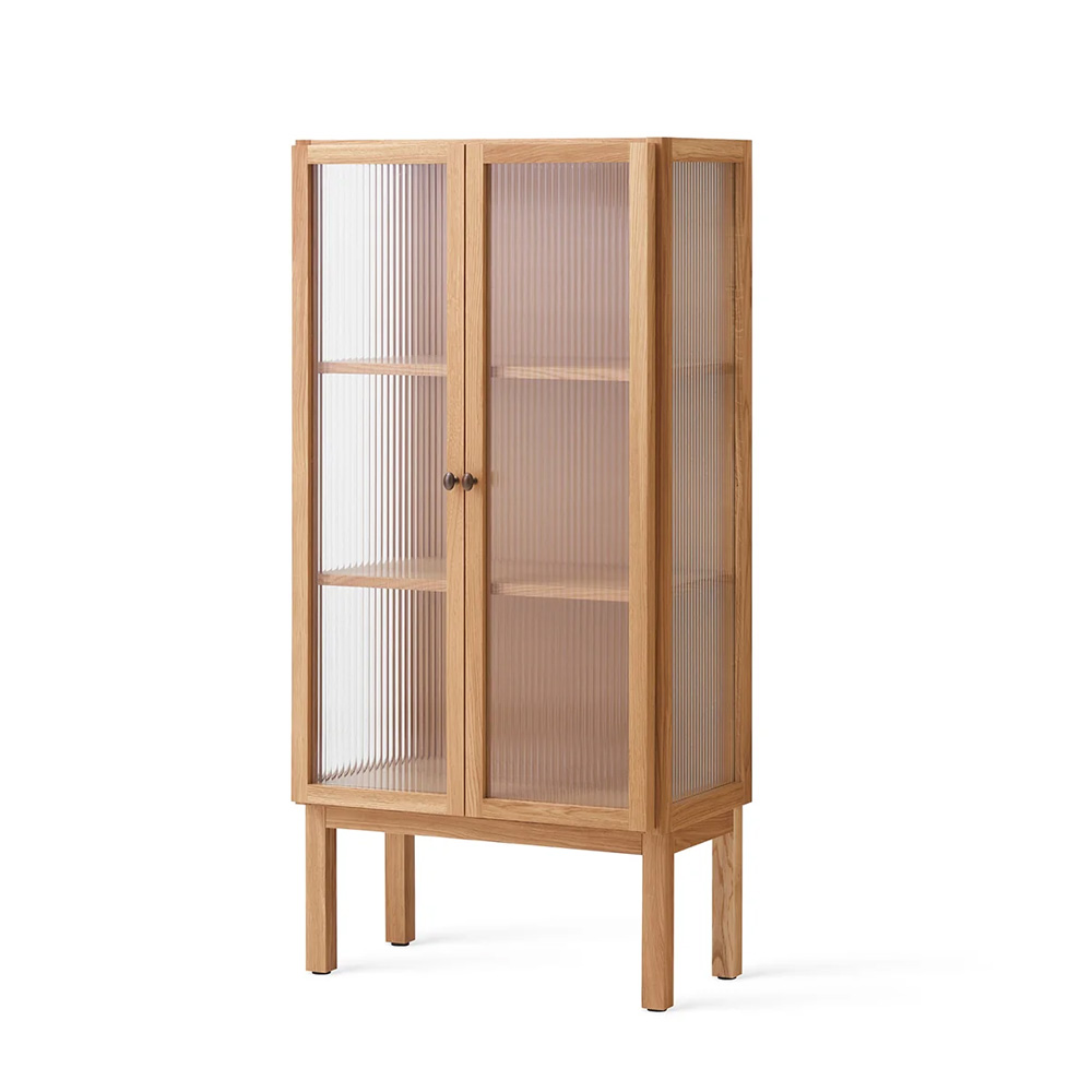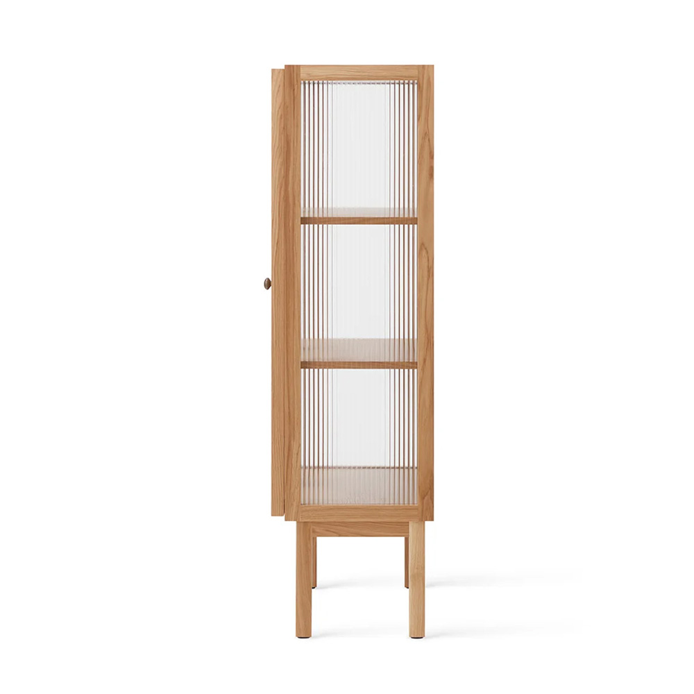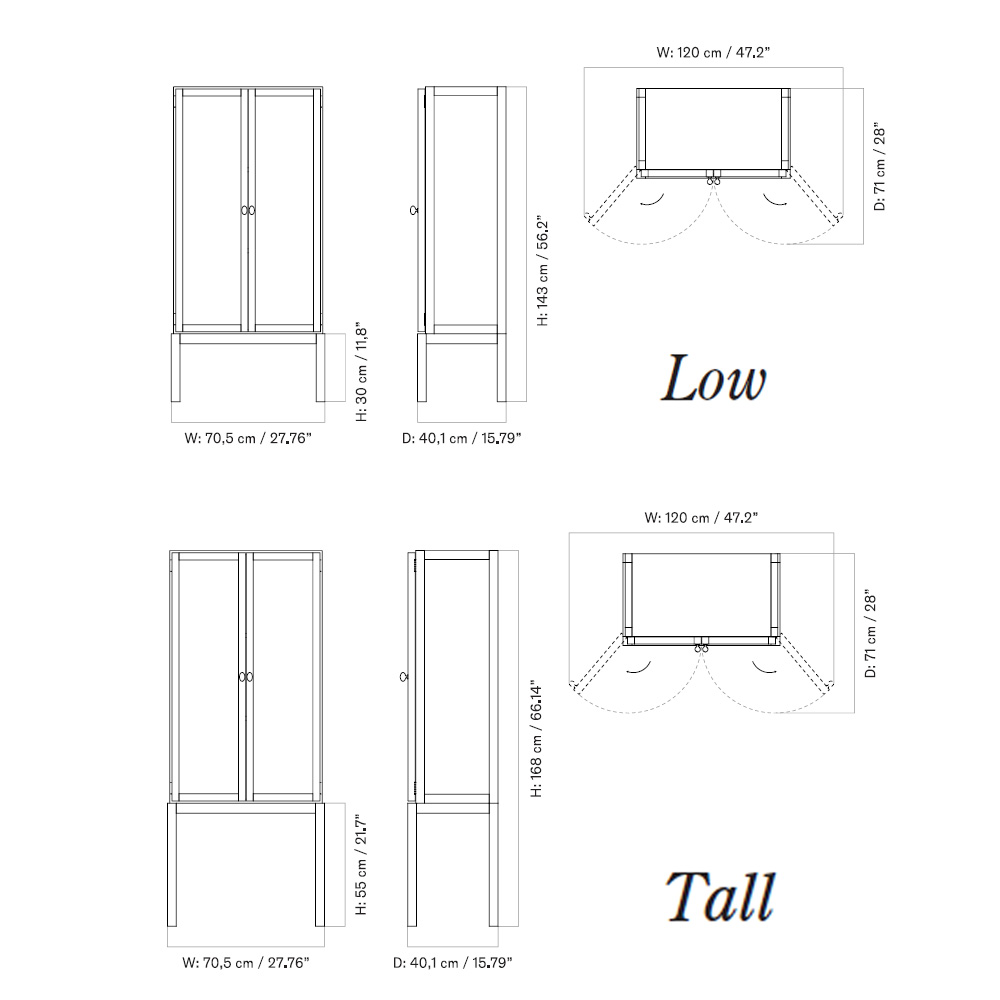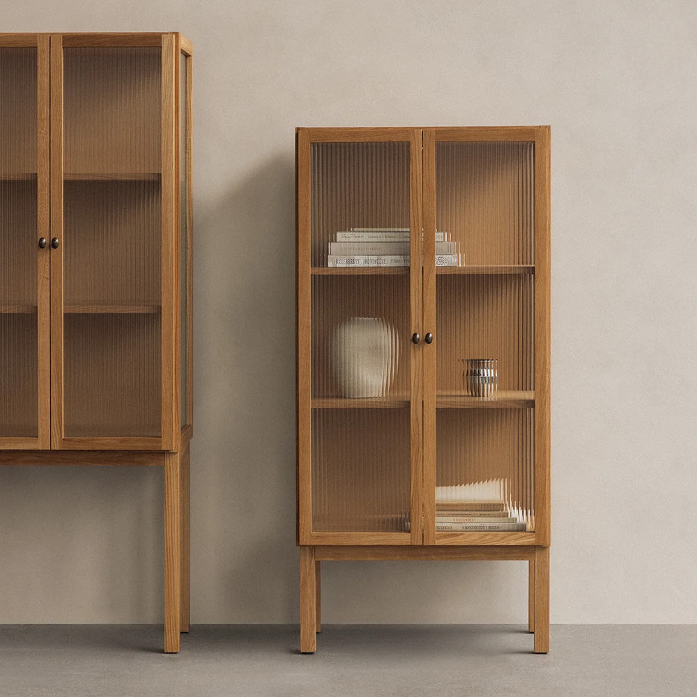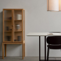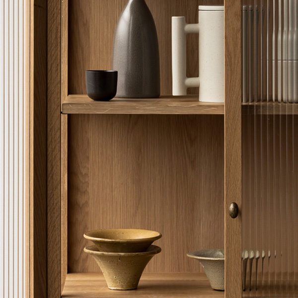開啟櫃門後,內部配置兩片可調整高度的橡木貼皮層板,提供充足且靈活的收納空間,適合擺放書籍、器皿或各式珍藏物件。細節之處搭配精緻黃銅鉸鏈與把手,為整體設計注入低調而優雅的金屬光澤。Curiosity 立櫃提供低櫃與高櫃兩種版本,能依不同空間需求靈活配置,在實用機能與北歐美學之間取得優雅平衡。