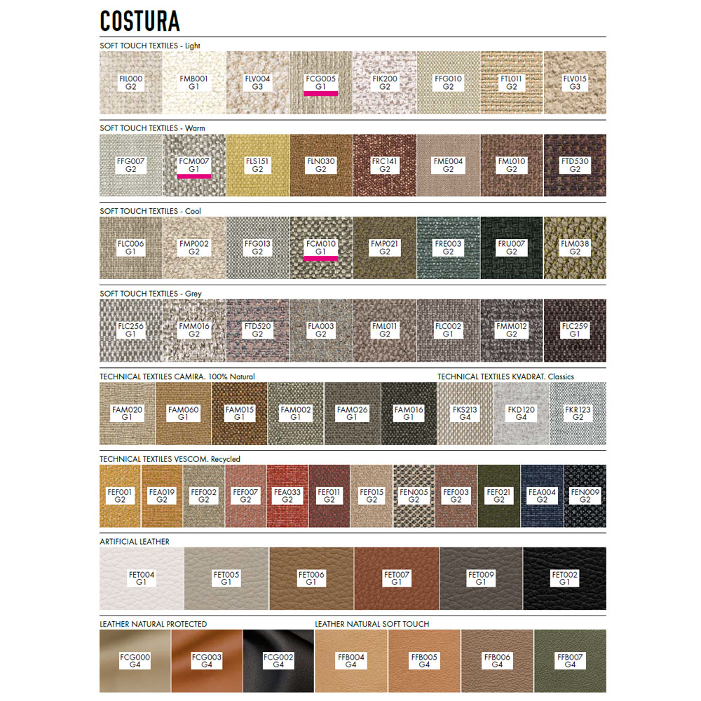 作為一套延展性極高的模組系統,Costura 提供不同尺寸與組件,可依照空間需求靈活配置;各模組皆以對稱結構設計,使貴妃椅能自由切換方向,整體組合也能隨時重新安排。纖薄的框架讓造型顯得格外利落,內部以堅固的模壓木材和前方鋁梁構成,支撐穩定而不佔視覺重量,經年使用仍能保持完好的挺度。黑色注塑鋁製沙發腳以保護地板的膠墊收尾,可依喜好直立或帶角度安裝,呈現簡潔或經典的不同風格,讓整體姿態更具設計表情。