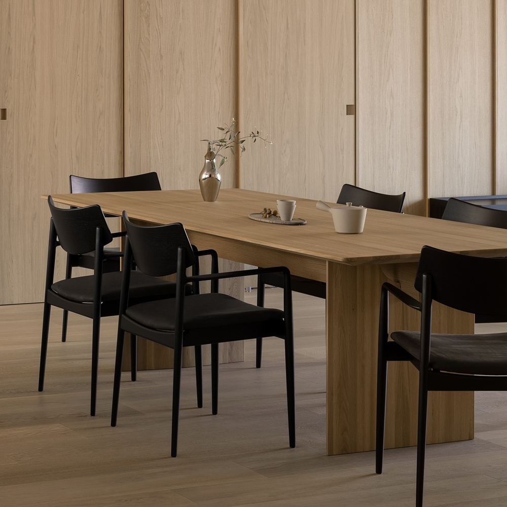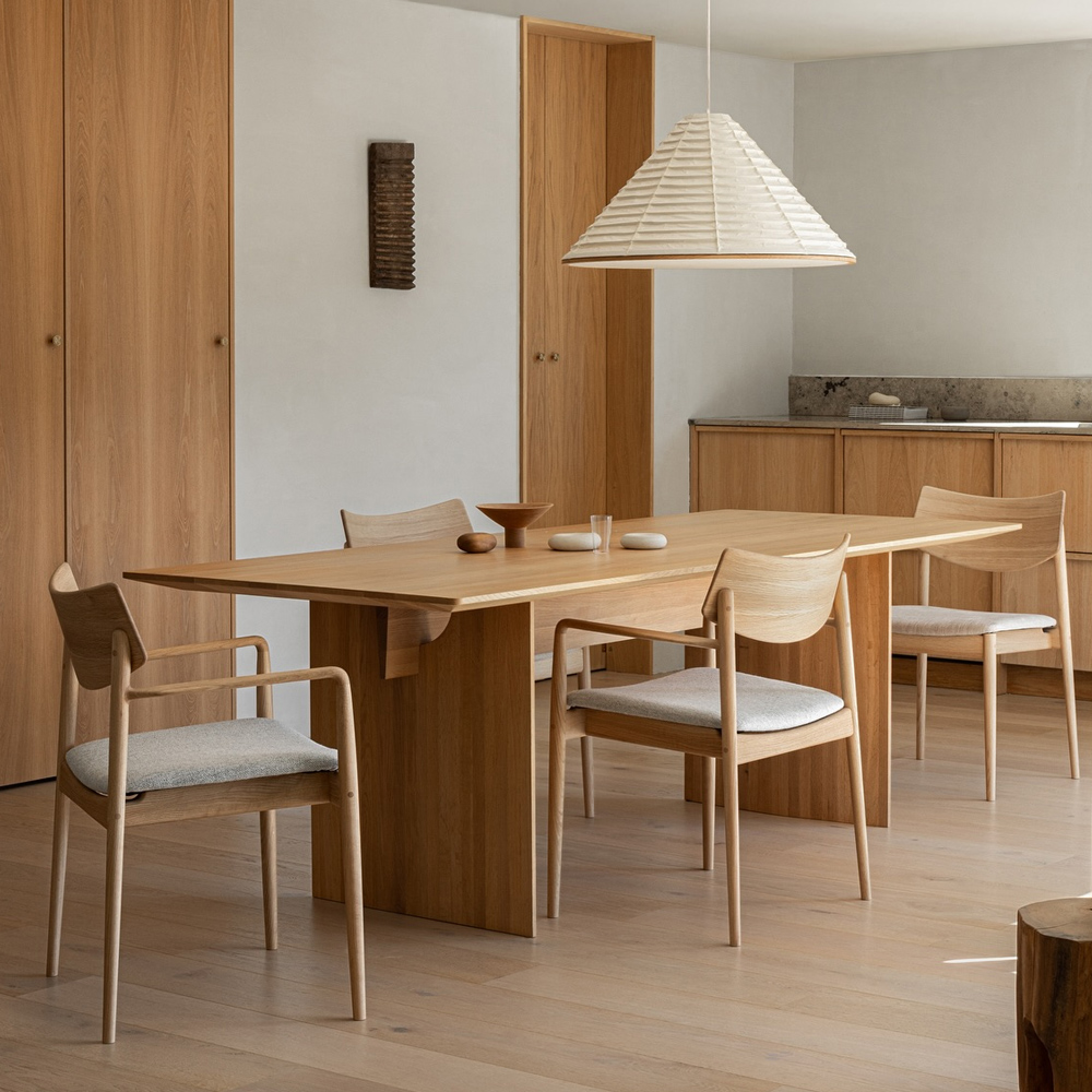 A-DC02 扶手椅採用豐富的材料和細節分層,展示了 Karimoku 的工藝。寬敞舒適的座椅營造出豐富而溫柔的時刻。靠背由實木雕刻而成,給人一種柔軟的印象,彷彿與座椅上的柔軟材料相呼應。