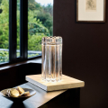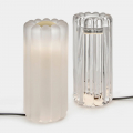 Press 桌燈擁有溫潤的輪廓和長條紋柱式外型,特色在於可替換的頂蓋,提供金、銀、黑三種樣式,讓您隨心變換光影質感。內建長型 LED 光源透過環型玻璃,折射出幾何切面光影,呈現晶瑩光譜效果,營造優雅氛圍。